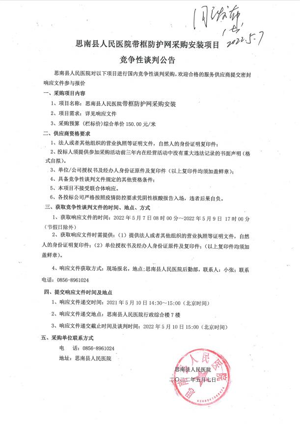 思南县人民医院关于带框防护网采购安装项目竞争性谈判公告