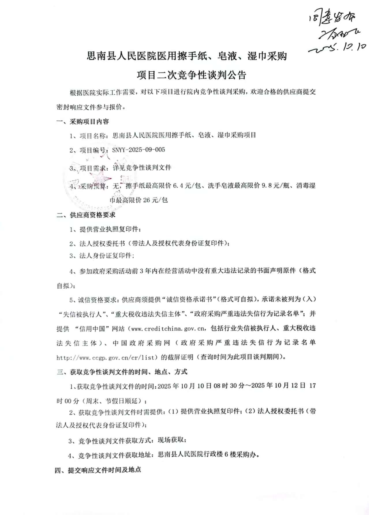 思南县人民医院医用擦手纸、皂液、湿巾采购项目二次竞争性谈判公告