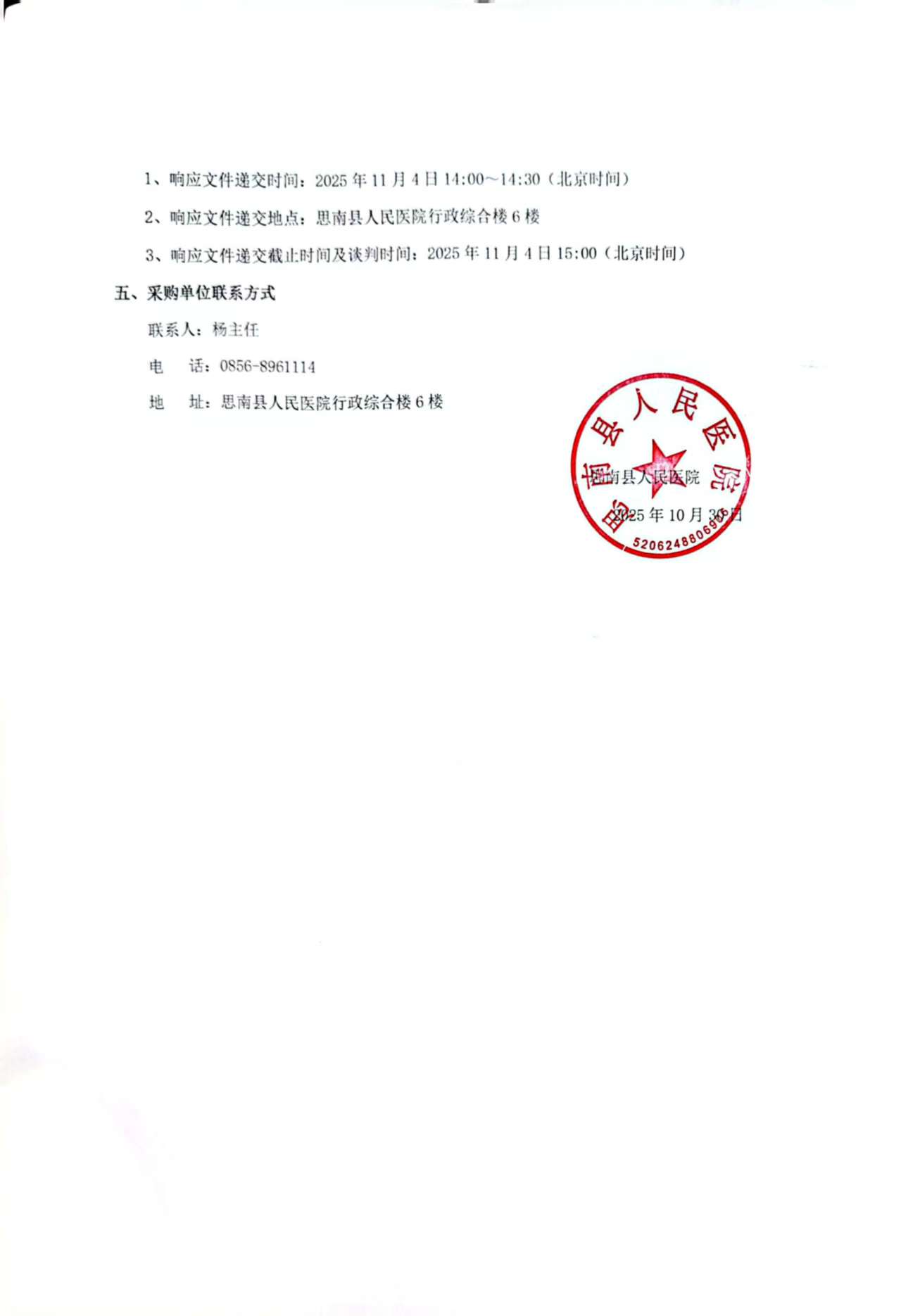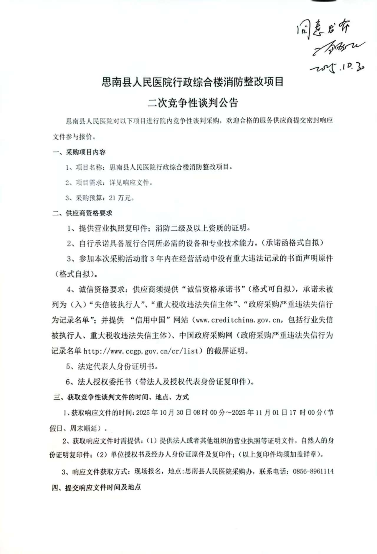 思南县人民医院行政综合楼消防整改项目二次竞争性谈判公告