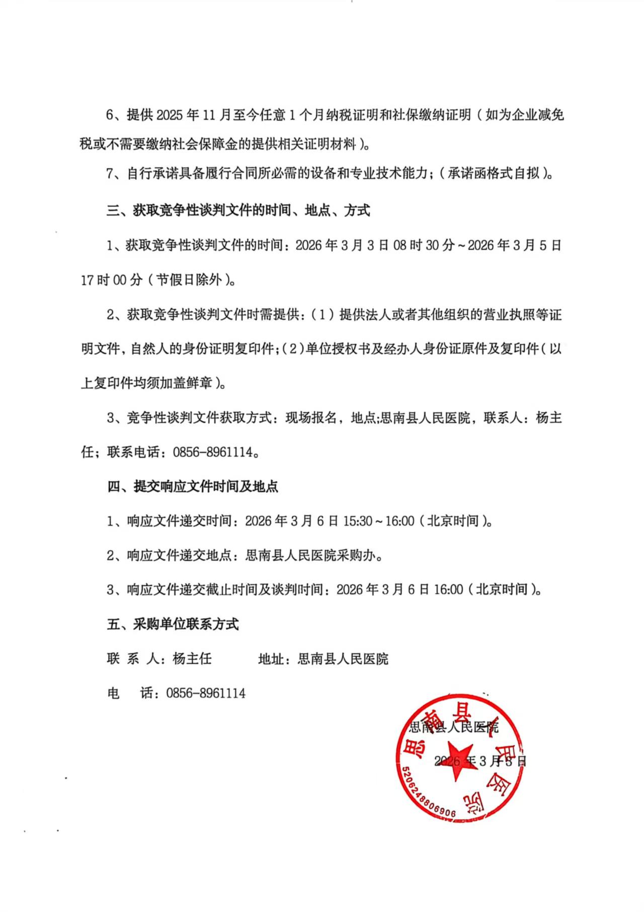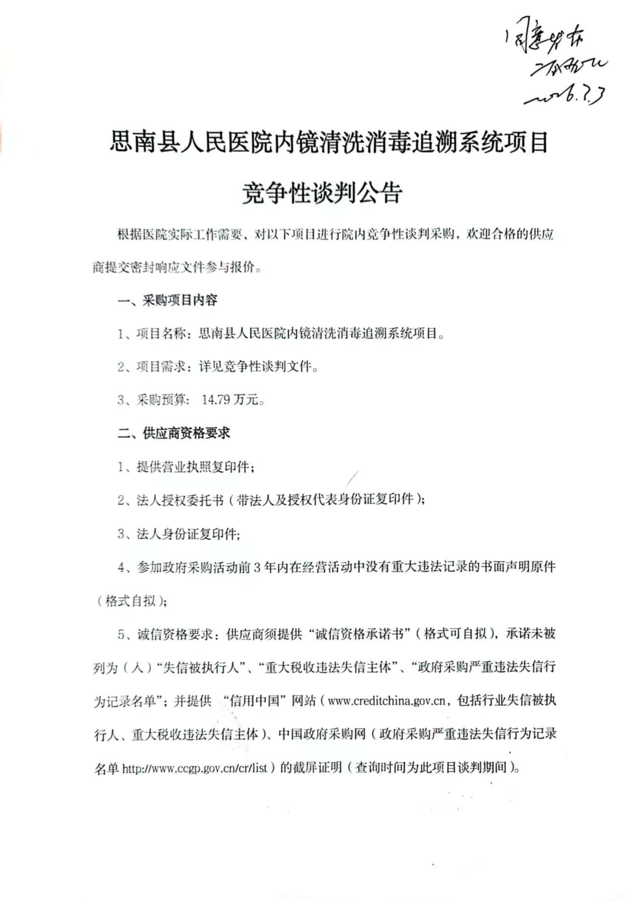 思南县人民医院内镜清洗消毒追溯系统项目竞争性谈判公告