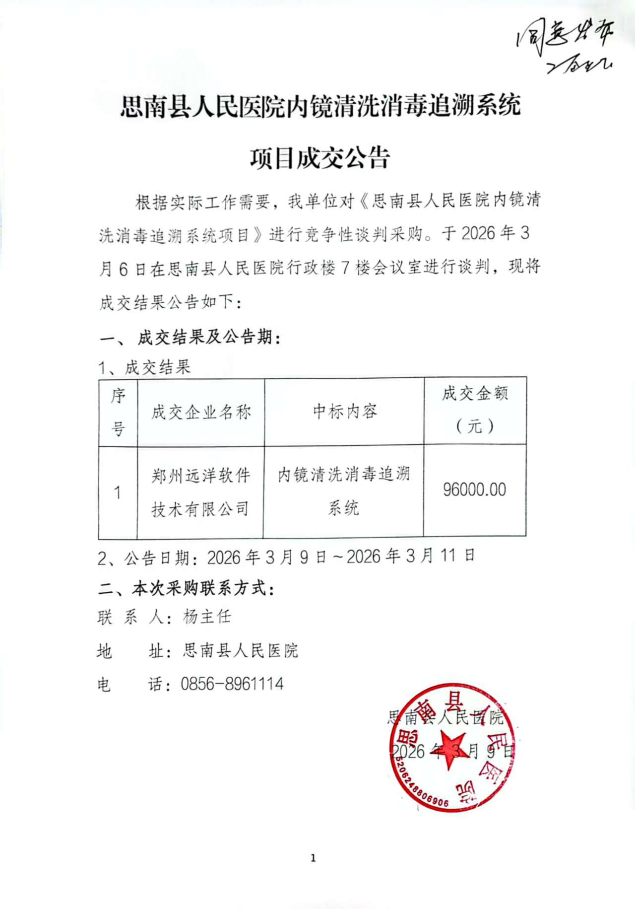 思南县人民医院内镜清洗消毒追溯系统项目成交公告