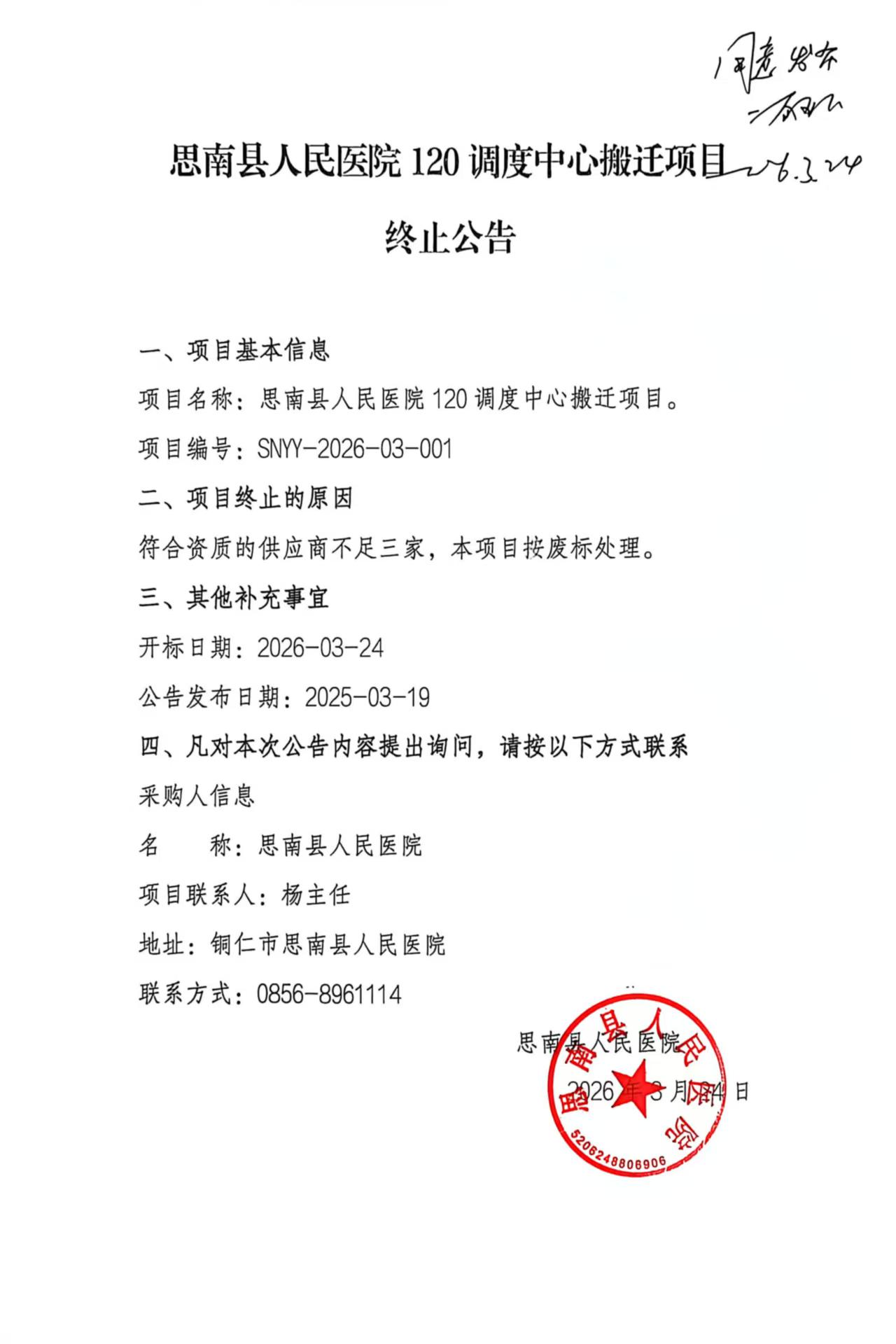 思南县人民医院120调度中心搬迁项目终止公告